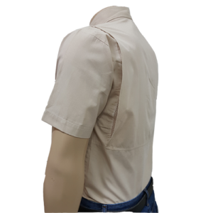 Camisa estilo especial, frente de camisa clasica y espalda es tipo columbia con respirador con calado en espalda a un color, manga corta, botón en el cuello, con un logotipo bordado de su empresa, telas de linea y alta calidad, confección de primera, doble costura, fabricada con maquinas industriales para mayor resistencia y durabilidad.