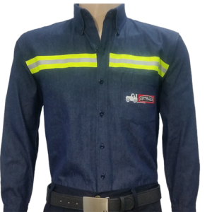Camisa estilo clásico a un color, en tela lona para camisa, manga larga, con cintas reflectivas para noche reflectivo 3M original y telas para dia, botón en el cuello, con un logotipo bordado de su empresa, telas de linea y alta calidad, confección de primera, doble costura, fabricada con maquinas industriales para mayor resistencia y durabilidad.