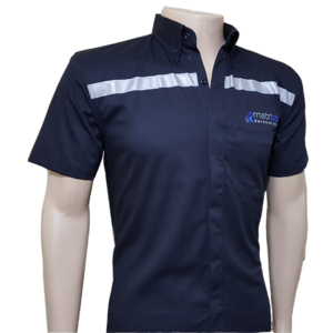 Camisa estilo clásico a un color, manga corta, con cintas reflectivas para noche reflectivo 3M original y telas para dia,  botón en el cuello, con un logotipo bordado de su empresa, telas de linea y alta calidad, confección de primera, doble costura, fabricada con maquinas industriales para mayor resistencia y durabilidad.