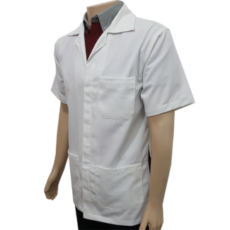 Bata manga corta para caballero, estilo medico, con un bordado pequeño en pecho, cierre de botón y botón escondido, una bolsa de parche en pecho izquierdo y dos bolsa por abajo de la falda de la bata, aberturas a los costados para poder introducir las manos en el pantalón sin necesidad de subirse la bata, en espalda cincho de tela de refuerzo y abertura vertical para comodidad, de alto rendimiento y para trabajo pesado, cómoda y duradera.